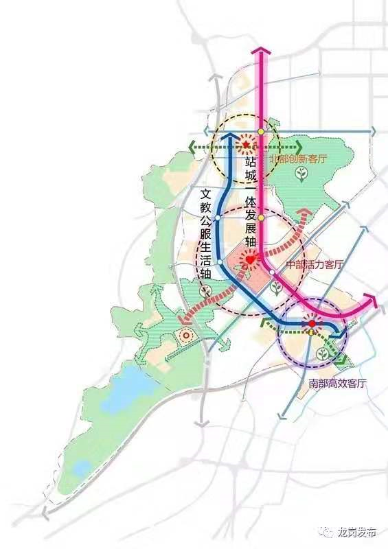 2019年7月,備受矚目的大運新城城市設計成果經(jīng)深圳市規(guī)劃和自然資源局審議正式出爐。未來的大運新城將是一座生態(tài)文明健康、學習文化濃厚、多維開放連接、創(chuàng)新活力迸發(fā)的高水平城市新客廳,形成“一主兩副、三心兩軸”的總體城市框架。其中“三心”為“一主兩副”三個城市客廳,即主客廳“中部活力客廳”,副客廳“北部創(chuàng)新客廳”和“南部高效客廳”?!皟奢S”為黃閣路“站城一體發(fā)展軸”和龍飛大道“文教公服生活軸”。