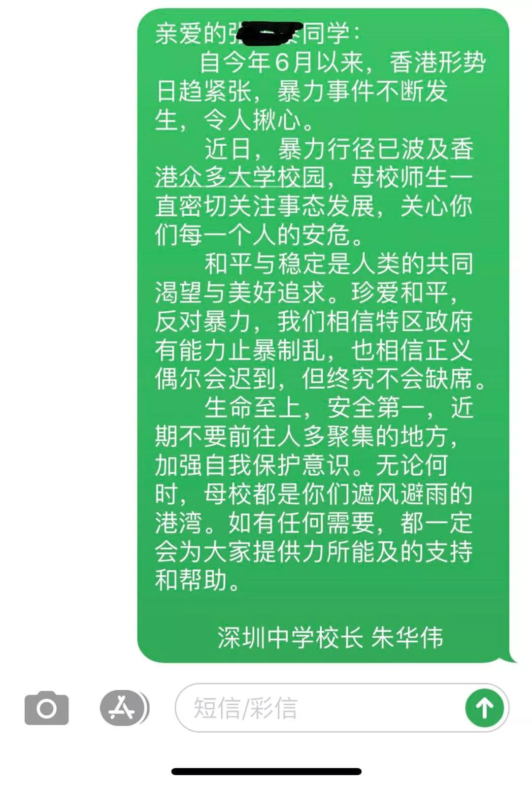 此外,深圳中學(xué)校長(zhǎng)朱華偉還向在港的深中學(xué)子發(fā)送了問(wèn)候短信,希望他們多注意自身安全,“無(wú)論如何,母校都是你們遮風(fēng)避雨的港灣”,讓收到短信的學(xué)子倍感溫暖。
