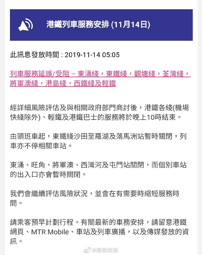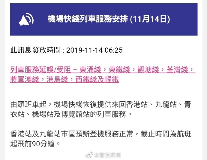 見圳客戶端·深圳新聞網(wǎng)2019年11月14日訊 過關(guān)香港的旅客注意:今天(14日)凌晨5:05分,港鐵發(fā)通知調(diào)整列車運(yùn)營服務(wù)時(shí)間。