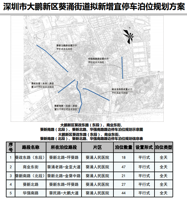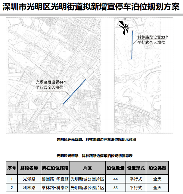其中,在寶安區(qū)3條道路新增316個宜停車泊位、龍崗區(qū)23條道路新增890個宜停車泊位、龍華區(qū)14條道路新增702個宜停車泊位、光明區(qū)9條道路新增305個宜停車泊位、大鵬新區(qū)5條道路新增157個宜停車泊位。具體規(guī)劃方案如下: