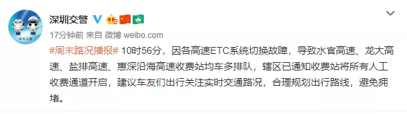 10時56分,因各高速ETC系統切換故障,導致水官高速、龍大高速、鹽排高速、惠深沿海高速收費站均車多排隊,轄區(qū)已通知收費站將所有人工收費通道開啟,建議車友們出行關注實時交通路況,合理規(guī)劃出行路線,避免擁堵。