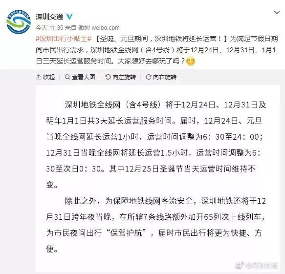 這里還要給大家插播一條交通消息。小編掐指一算,2019年馬上就要結(jié)束了,各位小伙伴是不是都開始,為新年假期做準備了呢?這么重要的出去浪的機會,怎能為趕不上末班地鐵煩惱?不要緊,地鐵也延長運營時間啦。