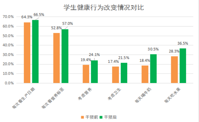 通過1學(xué)年的營(yíng)養(yǎng)教育活動(dòng),評(píng)估發(fā)現(xiàn),學(xué)生選擇經(jīng)常吃的零食中,水果類排名第一,占69.6%;糖果類由26.6%明顯下降至19.9%,降幅25%。經(jīng)常喝的飲料依次是白開水、純牛奶酸奶、果汁和碳酸飲料,干預(yù)后白開水和牛奶比例分別提升至83.4%和76.7%,升幅均超過10%;果汁和碳酸飲料分別降低至38.9%和17.3%,尤其是碳酸飲料降幅超過了30%。每天喝牛奶的比例明顯提升至30.5%,升幅65.8%;每天吃水果的比例提升至36.5%,升幅達(dá)到36.5%。每天吃早餐的比例由67.8%上升至74%。