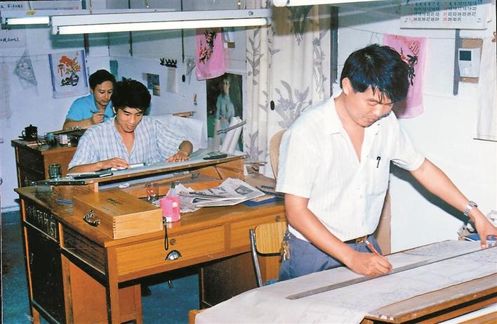 1988年蔡明在鐵皮房用圖版手工制圖。