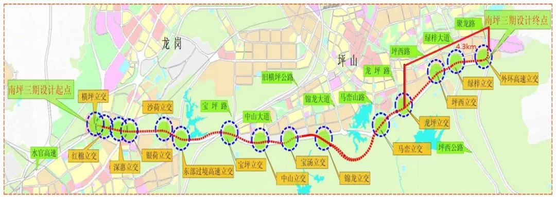 至于沿線立交方面,沿線龍崗大道立交、東部過境立交、中山立交、龍坪立交已開通。坪西立交計劃近期開通。