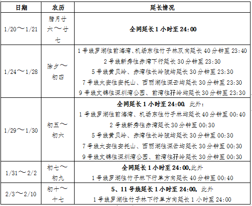 2020年春運(yùn)期間深圳地鐵延長(zhǎng)情況表: