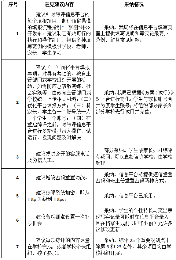 市教育局通報指出,在意見征集期間,該局共收到304個郵件及2個信件。市教育局對上述建議進行了統(tǒng)一的分類,這些建議被分成了34類,并組織了專家學(xué)者進行了認真研究。其中,有關(guān)平臺簡化、允許修改更新、建立綜評宣導(dǎo)隊伍等14類建議被采納,另有5類建議被部分采納,余下15類建議沒有被采納。