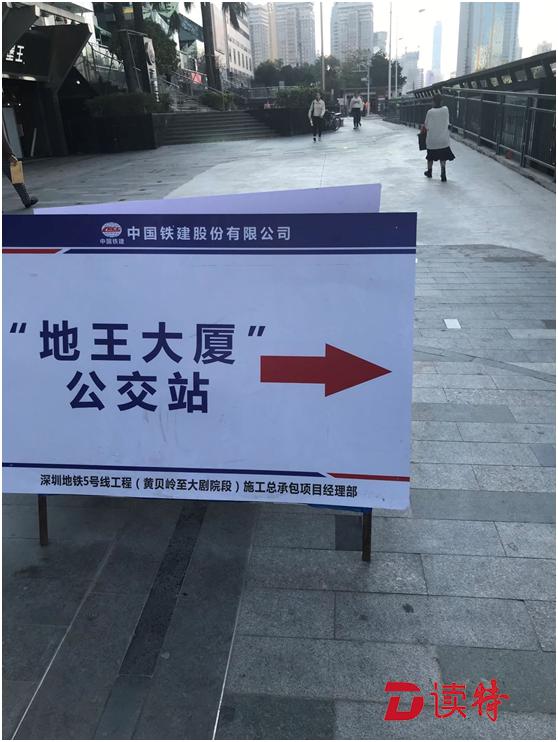 而另一處地點(diǎn),從大劇院地鐵站 F出口處往羅湖書城方向,行人須繞行街邊花園步道和街邊商家通道,對于騎自行車和電動車的人尤其不便。而地王大廈公交站臺跟崗廈北地鐵站②公交站臺一樣非常狹窄,站臺左右兩邊的人行道狹窄處僅約兩米寬。在該處站臺背后,中國鐵建股份有限公司設(shè)置了一塊站名指示牌,署名單位為地鐵5號線施工總承包項(xiàng)目經(jīng)理部。記者詢問了一位路過的市民,市民說經(jīng)常路過此地,應(yīng)該是地鐵施工所以就占用了之前的人行道,"這里走路還好,騎車就不方便了,因?yàn)橛信_階"。