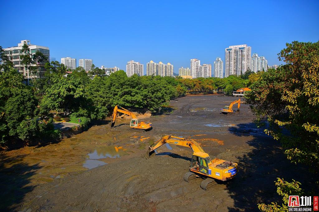 抽干東湖水后長臂挖機進行清淤作業(yè)。