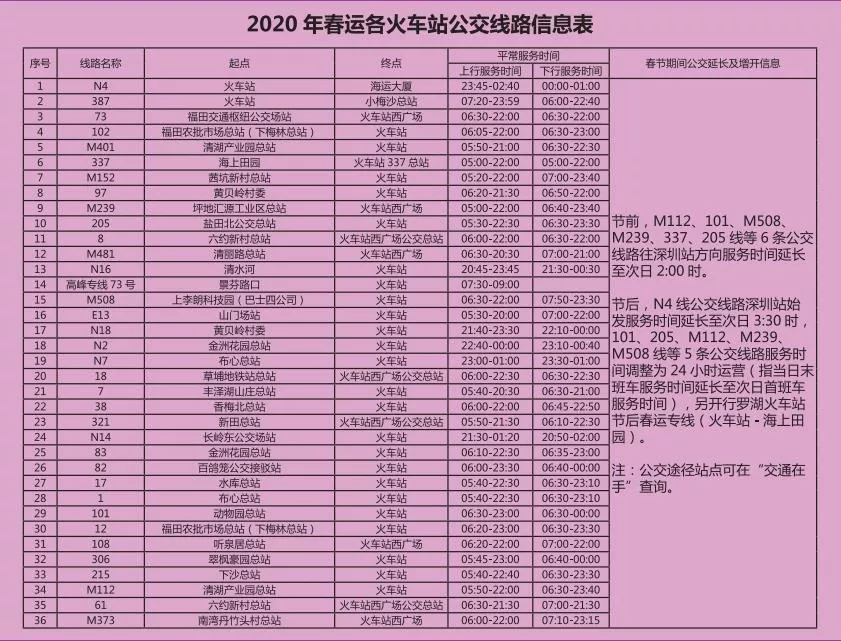 見圳客戶端·深圳新聞網(wǎng)2020年1月20日訊 又將迎來離深高峰,為方便大伙趕高鐵火車,深圳的公交地鐵都開啟最強加班模式,延長服務時間。很多小伙伴就很關心,途經(jīng)各大火車站的公交線有哪些?運營的時間是幾點?