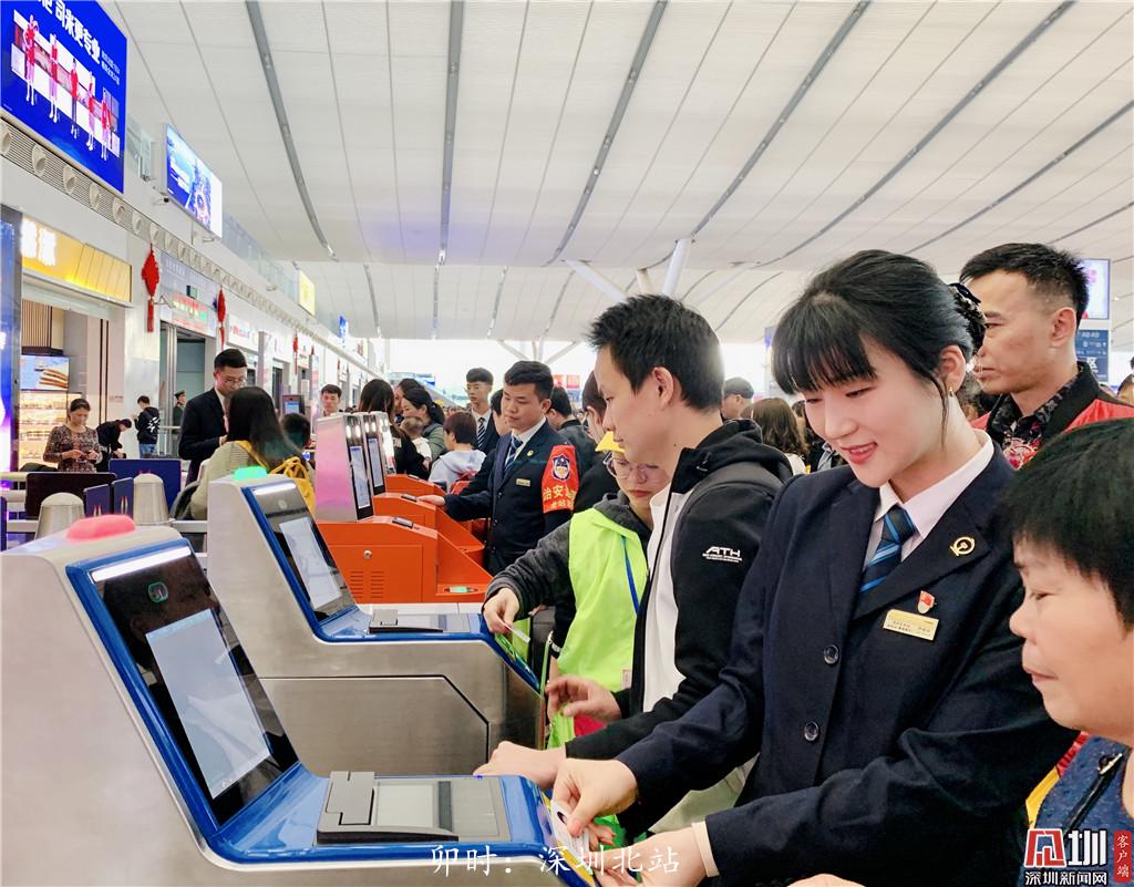 早晨6點50分左右,深圳北站候車大廳內(nèi),車站工作人員羅瑜欣幫助乘客檢票。
