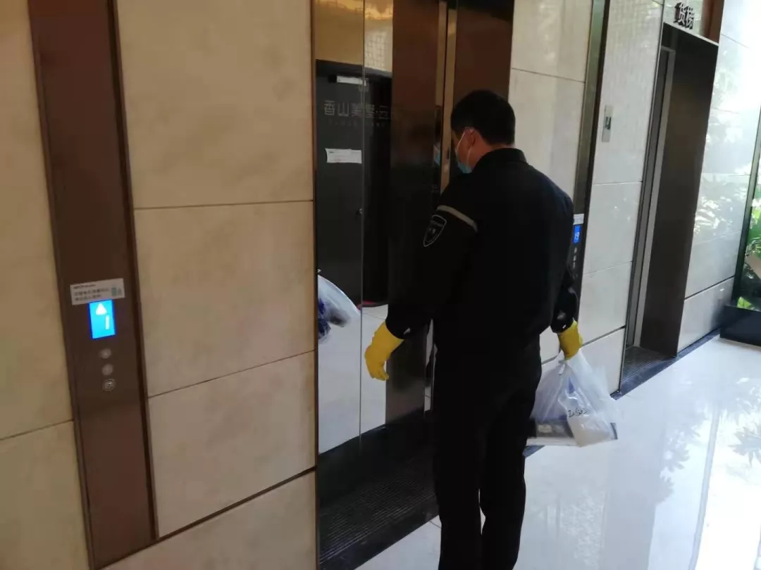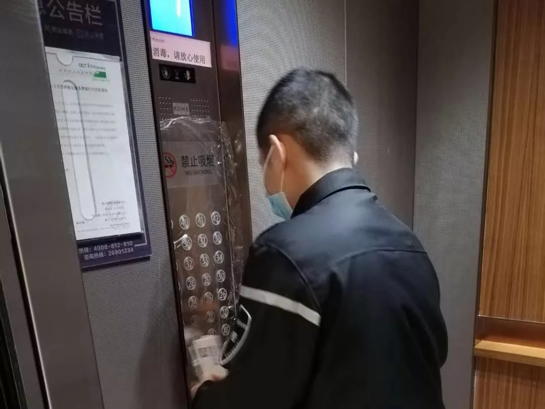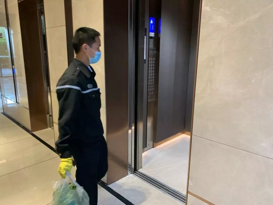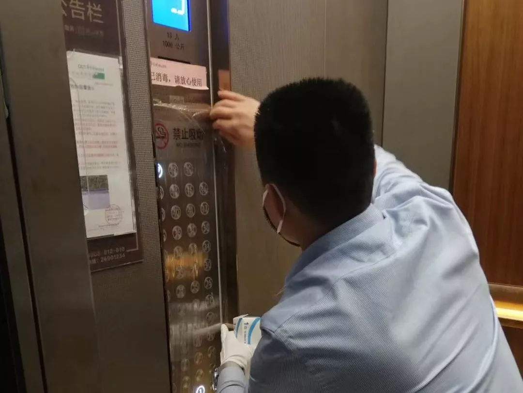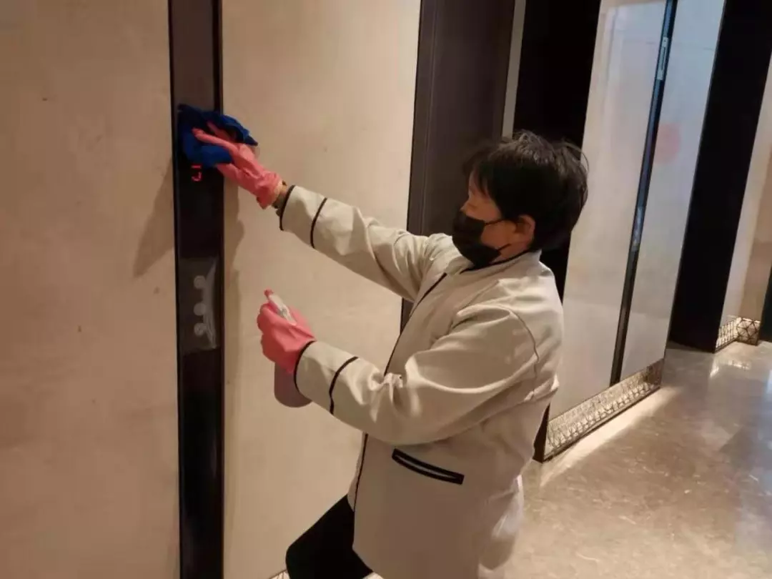 每天對(duì)小區(qū)公共區(qū)域大堂門(mén)把手、門(mén)禁對(duì)講機(jī)、電梯按鍵、大堂茶幾沙發(fā)等高頻接觸區(qū)進(jìn)行消毒及對(duì)轎廂按鈕定時(shí)更換保鮮貼膜。