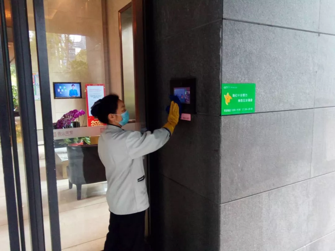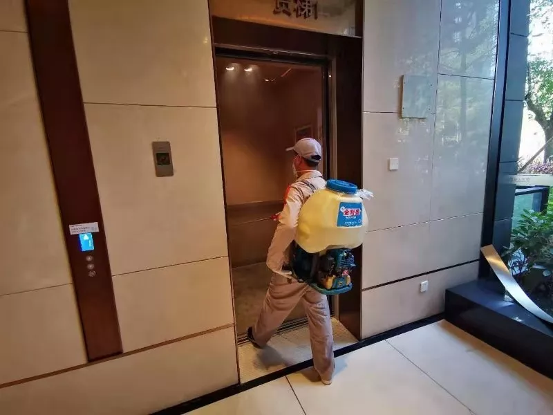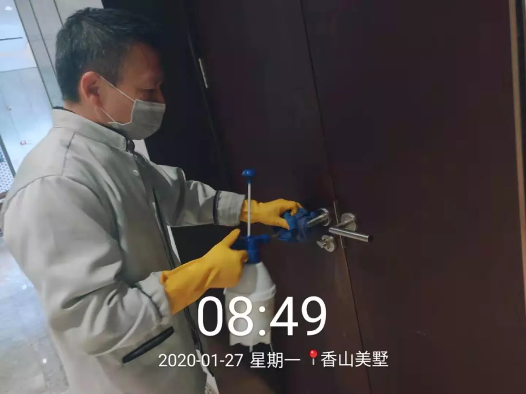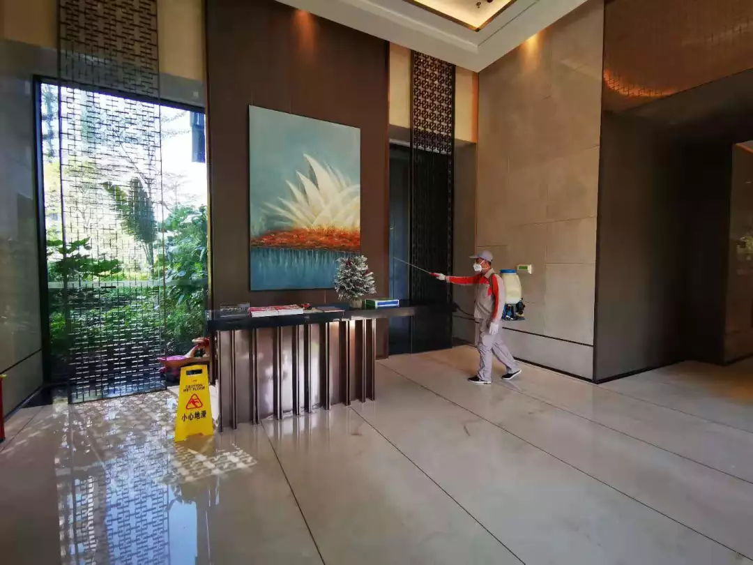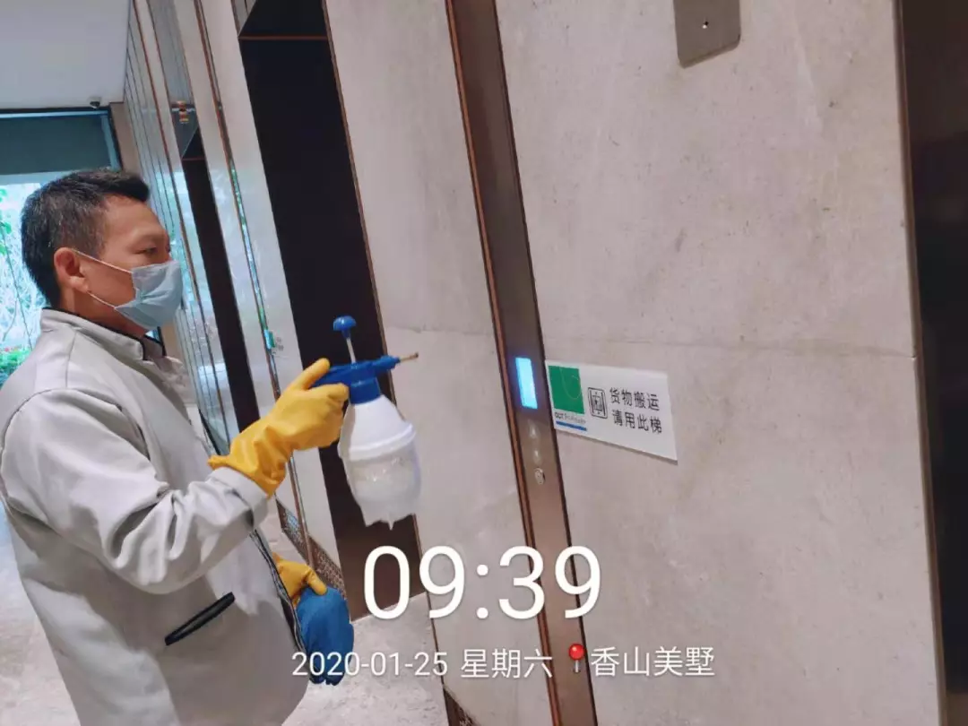 每天對(duì)小區(qū)公共區(qū)域大堂門(mén)把手、門(mén)禁對(duì)講機(jī)、電梯按鍵、大堂茶幾沙發(fā)等高頻接觸區(qū)進(jìn)行消毒及對(duì)轎廂按鈕定時(shí)更換保鮮貼膜。