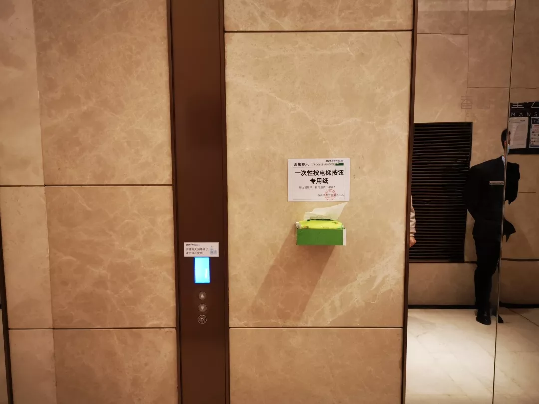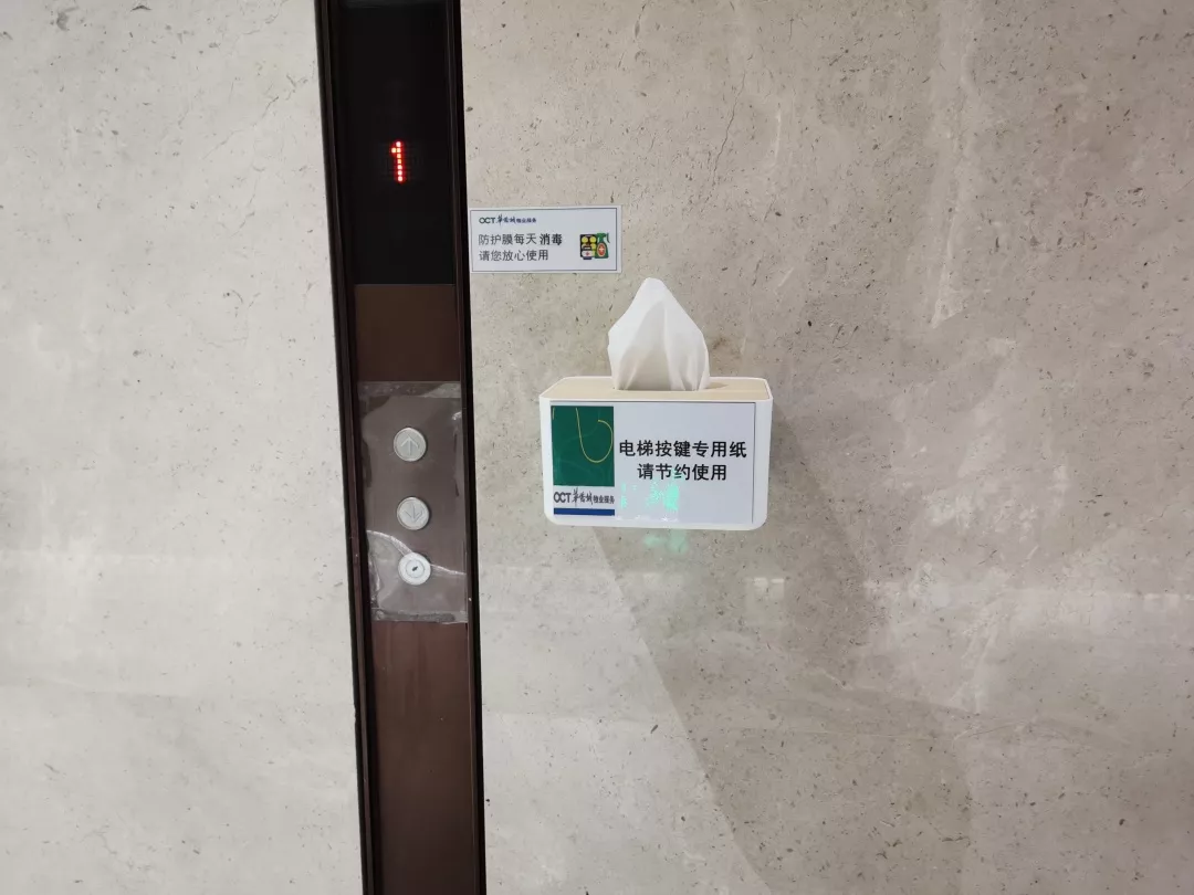 考慮到防控形勢(shì)需要,中心對(duì)電梯間及按鈕每天至少不低于2次消毒、且每天更換保鮮貼膜外,又于31日在各個(gè)電梯廳增設(shè)了一次性抽紙,供乘坐電梯按電梯按鈕時(shí)取用。(注:部分樓棟、明天陸續(xù)增設(shè)到位)