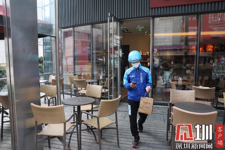 在咖啡店等待商家制作完成,取貨后,王彭輝便馬不停蹄地騎著電動(dòng)車前往訂單上的地址。平日繁華的南山商區(qū),現(xiàn)在空空蕩蕩的,除了偶爾有車輛開(kāi)過(guò),路上幾乎都是外賣小哥、快遞小哥的身影,“現(xiàn)在就是大家都待在家里,路上人和車少了,我們也能更快地把訂單送達(dá)?!蓖跖磔x說(shuō):“我以前是在梅林那邊工作,剛開(kāi)始來(lái)南山這邊送外賣的時(shí)候,對(duì)這里的路不熟悉,覺(jué)得每個(gè)路口都長(zhǎng)得一樣,抬頭都是大廈,低頭都是人,但是做得久了以后,慢慢的就熟悉了。”