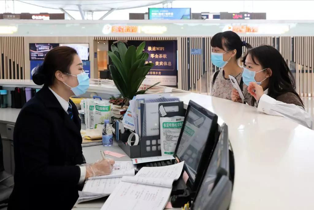 在機(jī)場(chǎng)檢疫站旁,醫(yī)務(wù)人員對(duì)旅客進(jìn)行詢問(wèn)和醫(yī)學(xué)健康篩查。