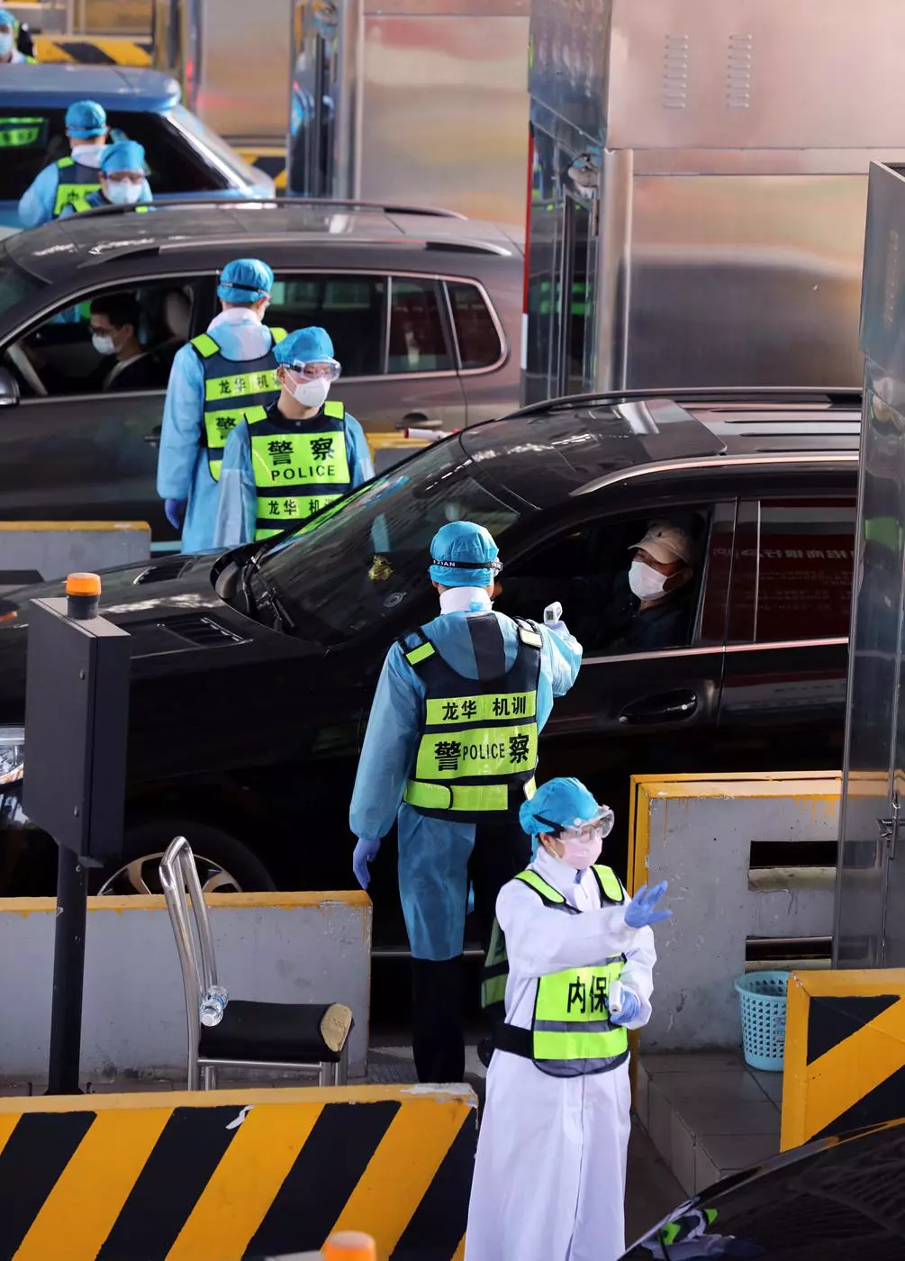 執(zhí)勤民警協(xié)助醫(yī)務(wù)人員對(duì)入深車輛上的人員進(jìn)行體溫檢測(cè)。