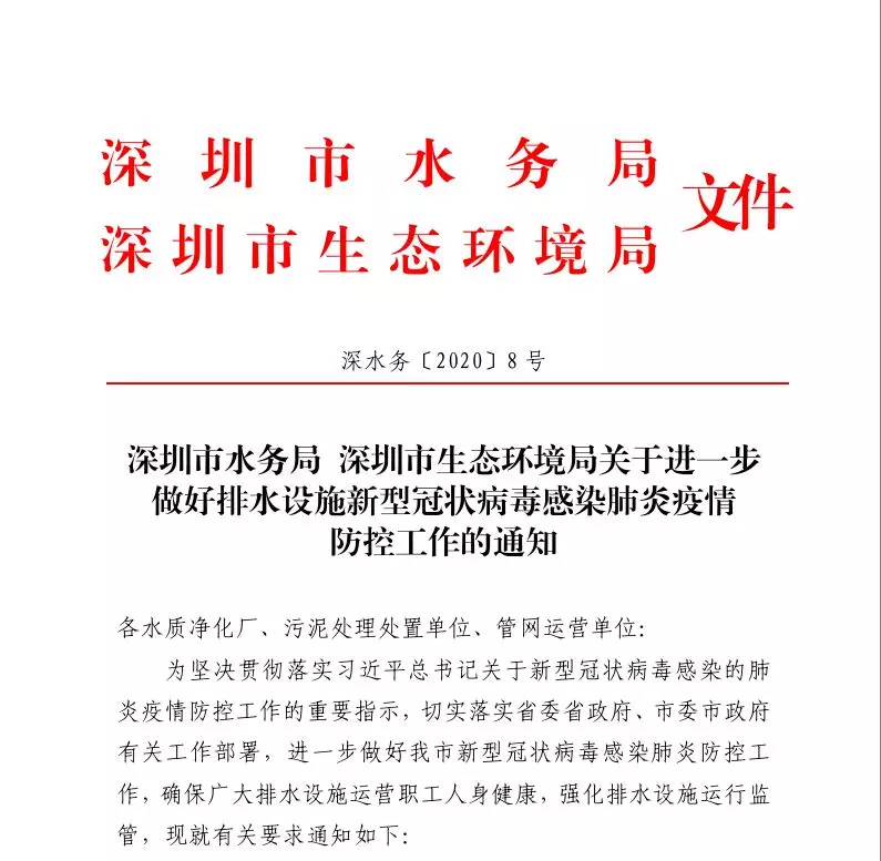 早在1月30日,深圳市水務(wù)局、深圳市生態(tài)環(huán)境局就聯(lián)合發(fā)布了《關(guān)于進(jìn)一步做好排水設(shè)施新型冠狀病毒感染的肺炎疫情防控工作通知》(以下簡稱《通知》),提前部署,明確要求全市要全力以赴做好排水設(shè)施疫情防控工作。