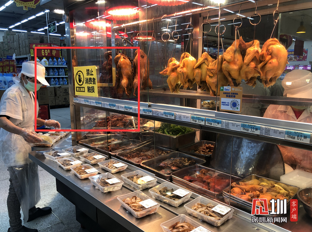 《公告》中提到,禁止商場、超市、糕點店、水果店提供食品“試吃”服務(wù)。記者看到,景田北沃爾瑪超市熟食區(qū)有明顯禁止消費者觸摸等標(biāo)志。“疫情防控期間,我們是禁止給市民提供試吃的?!蔽譅柆斚嚓P(guān)負(fù)責(zé)人說道。