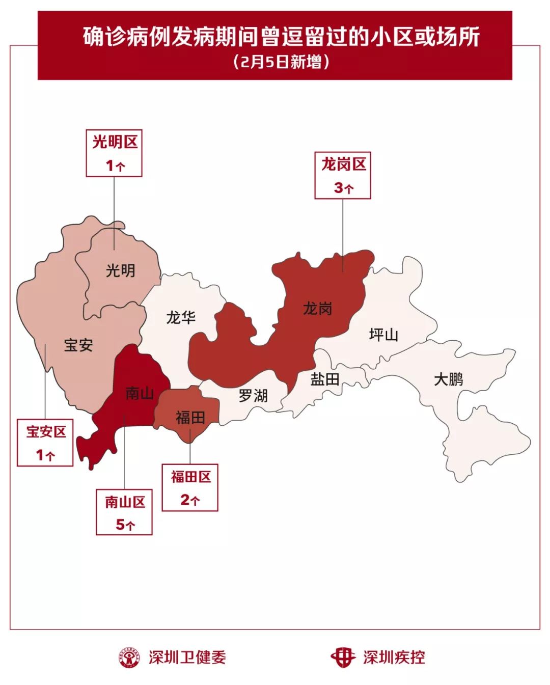 2月5日,疾控專業(yè)人員通過最新的流行病學(xué)調(diào)查確認(rèn),深圳新增12個小區(qū)(場所),有新確診的病人在出現(xiàn)病征期間曾經(jīng)逗留。