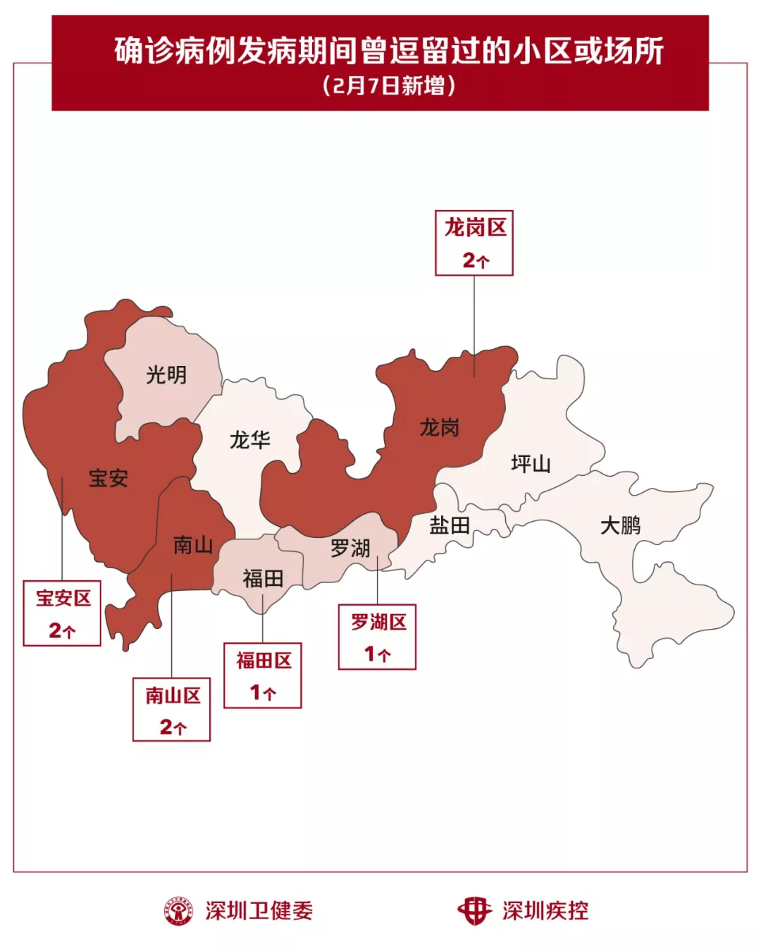 2月7日,疾控專業(yè)人員通過最新的流行病學(xué)調(diào)查確認(rèn),深圳新增8個(gè)小區(qū)(場(chǎng)所),有新確診的病人在出現(xiàn)病征期間曾經(jīng)逗留。