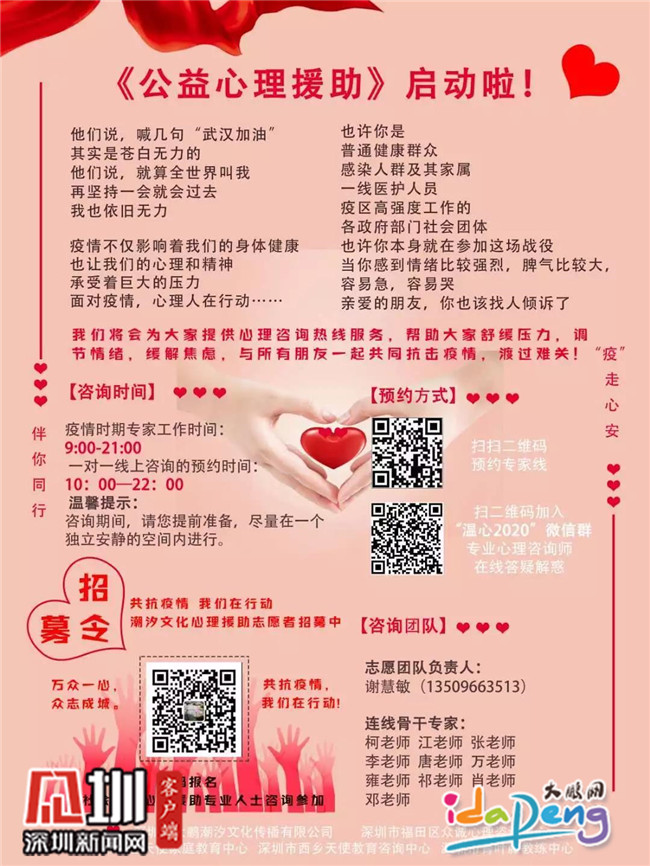 葵涌辦事處壩光社區(qū)婦聯(lián)副主席、大鵬潮汐文化傳播有限公司負(fù)責(zé)人謝慧敏積極響應(yīng)新區(qū)群團(tuán)工作部建立新區(qū)防疫心理疏導(dǎo)志愿服務(wù)隊(duì)的號(hào)召,聯(lián)合多家機(jī)構(gòu)啟動(dòng)公益心理援助,為市民提供線上調(diào)節(jié)情緒、舒緩壓力等免費(fèi)心理服務(wù),共渡心理關(guān),服務(wù)將持續(xù)到疫情結(jié)束。