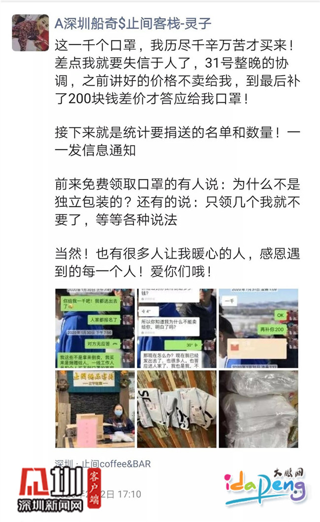 口罩作為最重要的防護(hù)物資之一,在這場(chǎng)疫情防控戰(zhàn)打響后需求量迅速增加,市面上的口罩供不應(yīng)求。大鵬新區(qū)女性創(chuàng)客示范民宿止間客棧老板黃靈芝在這樣的困局中仍想出份力,于是輾轉(zhuǎn)聯(lián)系上了在尼泊爾的朋友,從1月29日到31日,連續(xù)3天反復(fù)溝通協(xié)調(diào),終于買到了1000個(gè)口罩,免費(fèi)贈(zèng)送給市民以解燃眉之急。過程千辛萬苦,結(jié)果暖人暖心,她在朋友圈寫到:感恩遇到的每一個(gè)人。