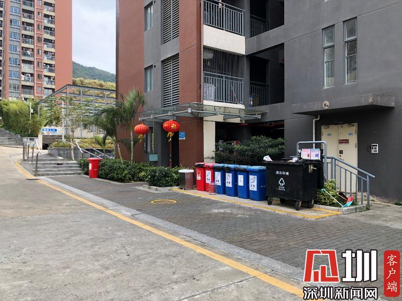 羅湖蓮馨家園小區(qū)的廢棄口罩回收桶與其他分類的垃圾回收桶分開(kāi)擺放。
