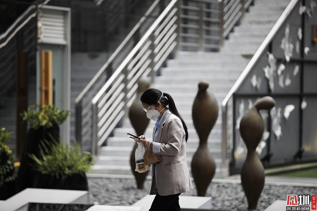 深圳軟件產(chǎn)業(yè)基地中,一位戴著口罩以及護(hù)目鏡的上班族。