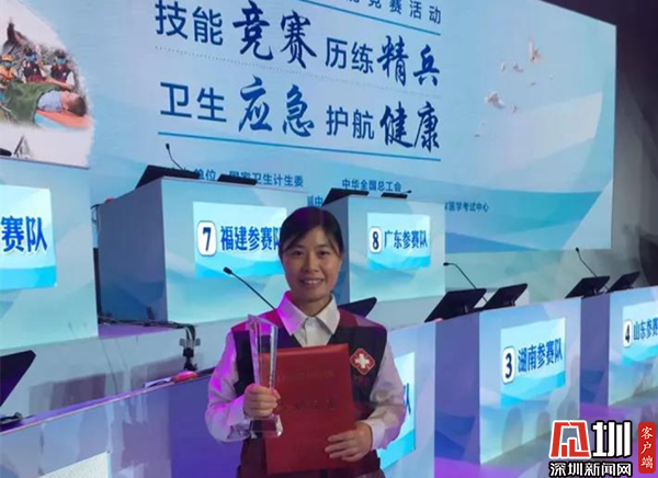曠翠萍在全國衛(wèi)生應(yīng)急技能大賽獲獎現(xiàn)場。