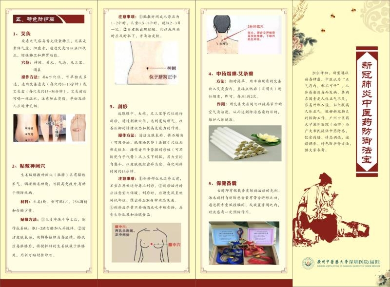 據(jù)張?zhí)旆?/span>介紹,中醫(yī)認(rèn)為“正氣存內(nèi),邪不可干”,人體感染疫毒而發(fā)病,其內(nèi)在因素是人體正氣不足,容易外邪入侵。如何提高人體正氣,做好新冠肺炎的防御工作,廣中醫(yī)深圳醫(yī)院制作了《新冠肺炎中醫(yī)藥防御法寶》將在近日印發(fā),派送到居民手中,指導(dǎo)市民運(yùn)用中醫(yī)藥特色方法,從情志調(diào)理、起居調(diào)控、飲食調(diào)養(yǎng)、傳統(tǒng)健身、中藥防感、特色防護(hù)等方面助力防控工作,傳授八段錦、經(jīng)絡(luò)拍打操、食療藥膳、中醫(yī)按摩手法、穴位艾炙等養(yǎng)生保健方法,增強(qiáng)體質(zhì),提高防控效果。