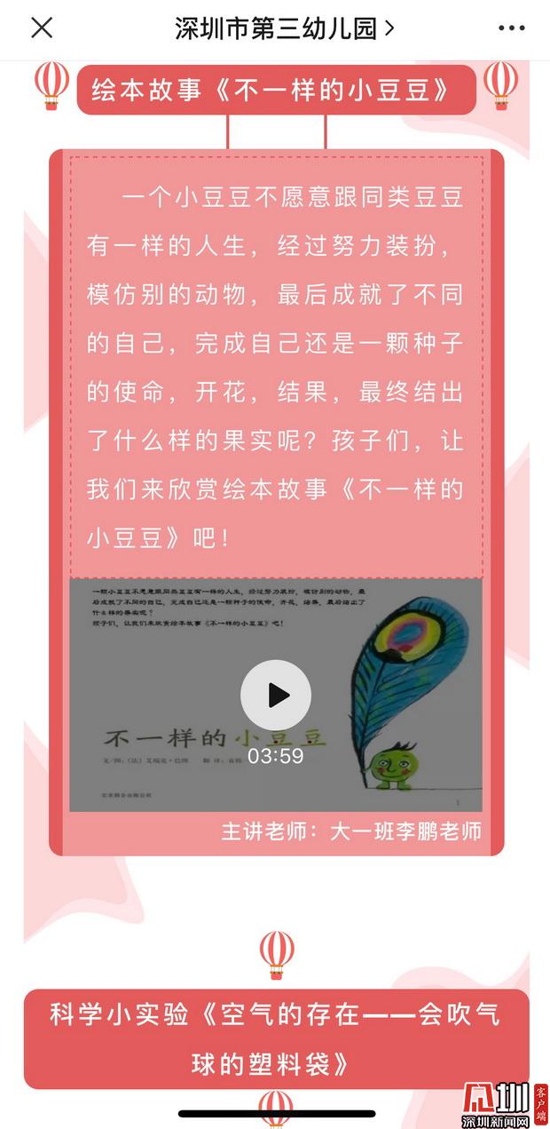 深圳市第三幼兒園園長邱雪華訴記者:“目前,三幼已經(jīng)開啟線上教學(xué)活動,我們充分運(yùn)用公眾號、微信群等網(wǎng)絡(luò)平臺,與家長、幼兒充分互動,陸續(xù)推出具有健康促進(jìn)特色的圖文推送,其中包括介紹防疫常識的攻略、由園長主講的園長電臺,還創(chuàng)辦了每日一期的原創(chuàng)系列游戲,以便家長在家也能獲取適宜的親子游戲活動資源?!庇浾咴谏钲谑械谌變簣@的微信公眾平臺上看到,幼兒園線上互動內(nèi)容豐富,其中包括視頻繪本故事、科學(xué)小實(shí)驗(yàn)以及親子體育游戲。每個版塊均由深圳市第三幼兒園老師們主講示范并錄制視頻,便于孩子及家長學(xué)習(xí)。