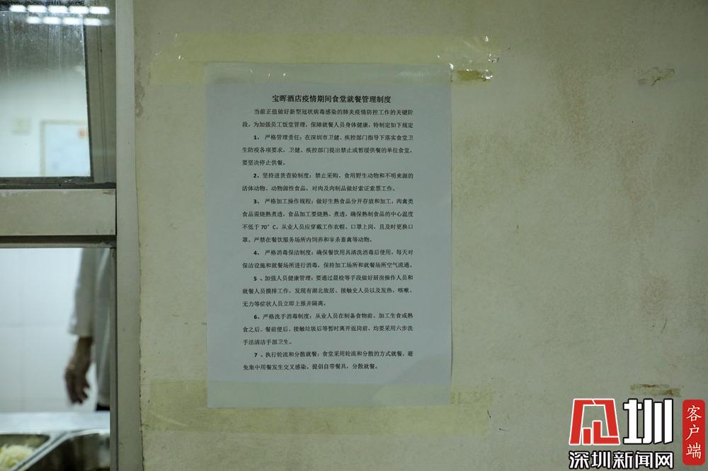 和大部分酒店選擇關(guān)閉餐廳不同,寶暉酒店員工食堂仍然開(kāi)放,但是制定了嚴(yán)格的就餐制度,實(shí)行分時(shí)段就餐、由廚師統(tǒng)一打飯菜、按統(tǒng)一朝向間隔就坐等規(guī)定。