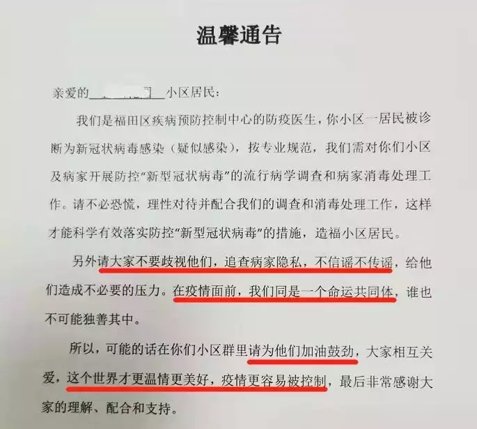 “疫情面前,我們同是一個命運共同體”“大家相互關(guān)愛,這個世界才更溫情美好,疫情更容易被控制……”1月30日,位于深圳福田區(qū)的一小區(qū)出現(xiàn)新冠肺炎疑似感染病例,福田區(qū)疾病預(yù)防控制中心的防疫醫(yī)生隨即發(fā)布了這則通告,瞬間刷屏了深圳人的朋友圈。通告除了呼吁小區(qū)居民配合調(diào)查及消毒處理工作外,還特地懇請大家“不要歧視,在疫情面前,我們是同一個命運共同體,誰也不可能獨善其身。”寥寥數(shù)字的“請求”,感動無數(shù)人。