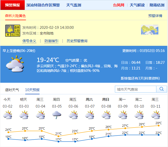 見圳客戶端·深圳新聞網2020年3月2日訊 深圳市氣象臺預計,3月2日深圳多云,有零星小雨,氣溫19-24℃,東北風3-4級,沿海、海區(qū)和高地陣風6-7級;3日多云間陰天,有零星小雨;4日多云間陰天有小雨;5-6日陰天到多云有小雨或零星小雨,氣溫略微下降;7-9日多云,氣溫逐日回升。