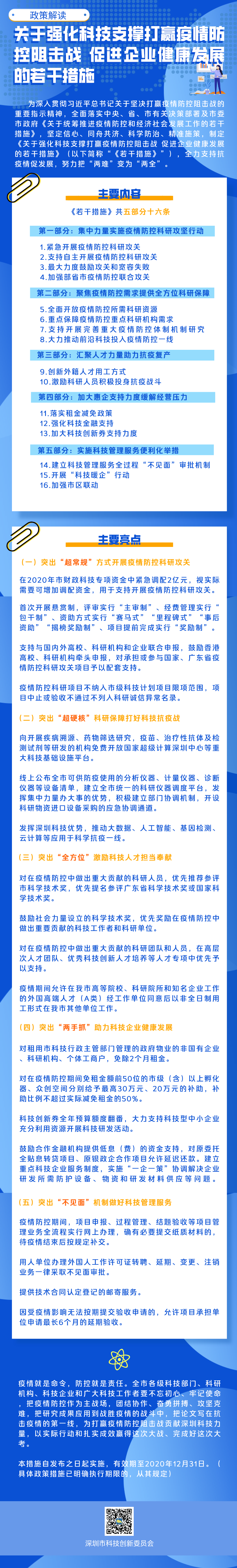 見圳客戶端·深圳新聞網(wǎng)2020年3月3日訊(見圳客戶端、深圳新聞網(wǎng)記者 陳婕)為深入貫徹習近平總書記關于堅決打贏疫情防控阻擊戰(zhàn)的重要指示精神,深圳市科技創(chuàng)新委員會制定《關于強化科技支撐打贏疫情防控阻擊戰(zhàn)促進企業(yè)健康發(fā)展的若干措施》(以下簡稱“《若干措施》”),《若干措施》共五部分十六條,其中,突出“超常規(guī)”方式,在2020年財政科技專項資金中緊急調配2億元,視實際需要可增加調配資金,用于支持開展疫情防控科研攻關,努力把“兩難”變?yōu)椤皟扇薄?/p>