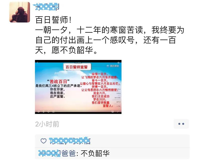 “生于非典,考于新冠,2020,我們注定不凡!疫情當(dāng)前,雖然我們隔離在家,不能像往屆那樣,齊聚學(xué)校體育館舉行誓師大會,意氣風(fēng)發(fā)地走進(jìn)學(xué)校精心準(zhǔn)備的“成功門”,伴隨奮進(jìn)的樂聲高喊出我們的誓言,在“簽名紀(jì)念墻”上寫下對未來的期盼。但即使相隔網(wǎng)絡(luò)兩端,我們依然有老師祝福和引導(dǎo),有家長的鼓勵和支持,有同窗的幫助和陪伴,高考百日,我們?nèi)栽谝黄鹫癖鄹吆簦?020高考,我們準(zhǔn)備好了。”