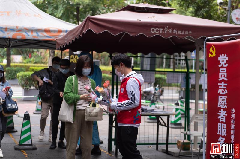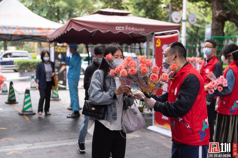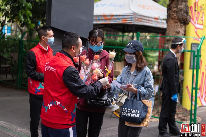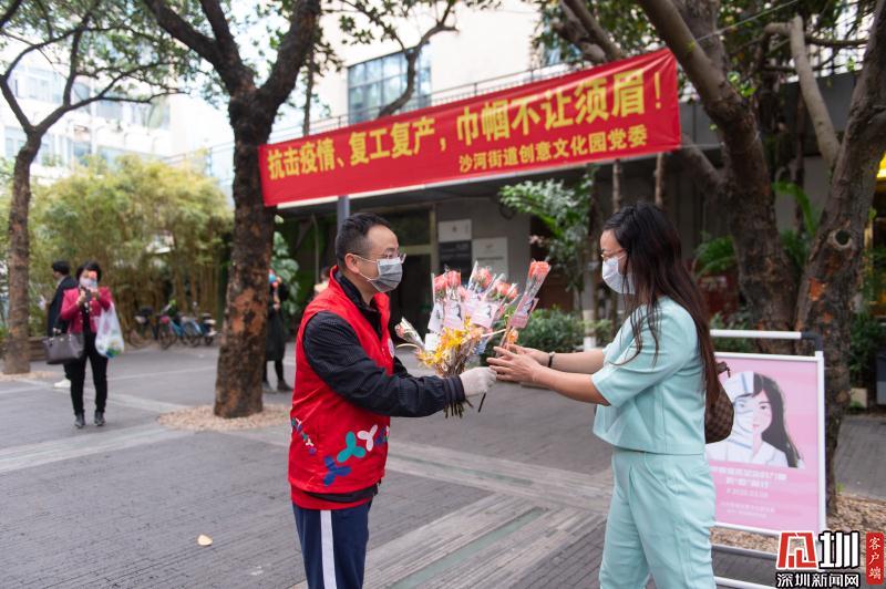 見圳客戶端·深圳新聞網(wǎng)2020年3月6日訊 3月6日上午,春暖花開,萬物更新。華僑城創(chuàng)意文化T街入口,進(jìn)入園區(qū)上班的員工除了接受體溫檢測(cè)、出示入園卡等常規(guī)動(dòng)作外,女員工意外收到了一束鮮花和一張“三八”節(jié)賀卡,賀卡上寫著:帶著溫柔堅(jiān)定的力量抗“疫”前行!這是園區(qū)黨員志愿者對(duì)“抗擊疫情、復(fù)工復(fù)產(chǎn)”中廣大女職工的禮贊。