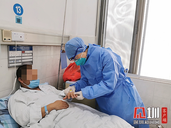 剛剛看到檢測(cè)結(jié)果,鄺醫(yī)生便迅速穿上防護(hù)服,進(jìn)入隔離區(qū)跟患者進(jìn)行了面對(duì)面的溝通交流。那位患者得知自己檢測(cè)的結(jié)果后略顯失落,嘆了一口氣,似乎是擔(dān)心焦慮等待了多日,心里的石頭終于落了地。他說:“我一定聽您的話,好好吃藥,好好治療,爭(zhēng)取活著回來?!?/p>