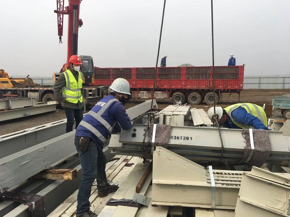 任丘能源生態(tài)園復(fù)工后首車鋼結(jié)構(gòu)到現(xiàn)場,相關(guān)人員正在有序清點、卸車、堆放,為下一步安裝工程夯實基礎(chǔ)。