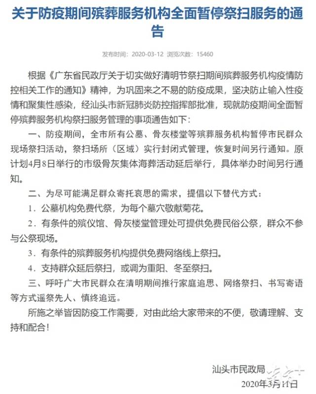 汕頭全市所有公墓、骨灰樓堂等殯葬服務(wù)機(jī)構(gòu)暫停市民群眾現(xiàn)場(chǎng)祭掃活動(dòng),祭掃場(chǎng)所(區(qū)域)實(shí)行封閉式管理,并提倡以下替代方式:公墓機(jī)構(gòu)免費(fèi)代祭,為每個(gè)墓穴敬獻(xiàn)菊花;有條件的殯儀館、骨灰樓堂管理處可提供免費(fèi)民俗公祭,群眾不參與公祭現(xiàn)場(chǎng);有條件的殯葬服務(wù)機(jī)構(gòu)提供免費(fèi)網(wǎng)絡(luò)線(xiàn)上祭掃;支持群眾延后祭掃,或調(diào)為重陽(yáng)、冬至祭掃。