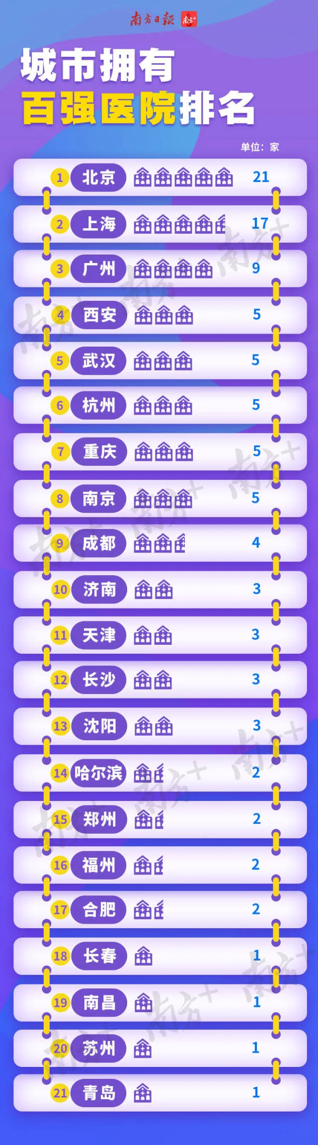 南方經濟智庫梳理后發(fā)現(xiàn),全國排名前100的醫(yī)院中,47所被北京、上海、廣州囊括。前10個城市包攬幾乎總數(shù)80%的百強醫(yī)院。