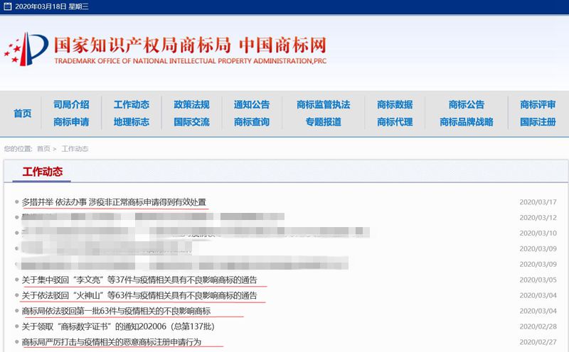 從2月27日到3月17日,商標(biāo)局工作動態(tài)有5條和涉疫非正常商標(biāo)申請有關(guān)(劃紅線處)