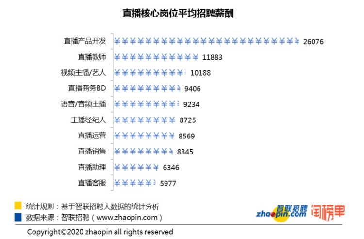 知識、技術(shù)密集型和資源密集型的崗位往往工資更高,這對于直播人才也同樣適用。細分來看,負責直播界面設(shè)計、開發(fā)、測試、運維等多階段把控的直播產(chǎn)品開發(fā)崗位以26076元/月的高薪位居薪酬第一。此外,直播教師的平均薪資達到11883元/月;直播招聘“顏值”需求最高的,視頻主播/藝人的平均薪資為10188元/月。而同樣作為直播主角的語音主播,由于門檻更低,平均薪資是視頻主播的9成。