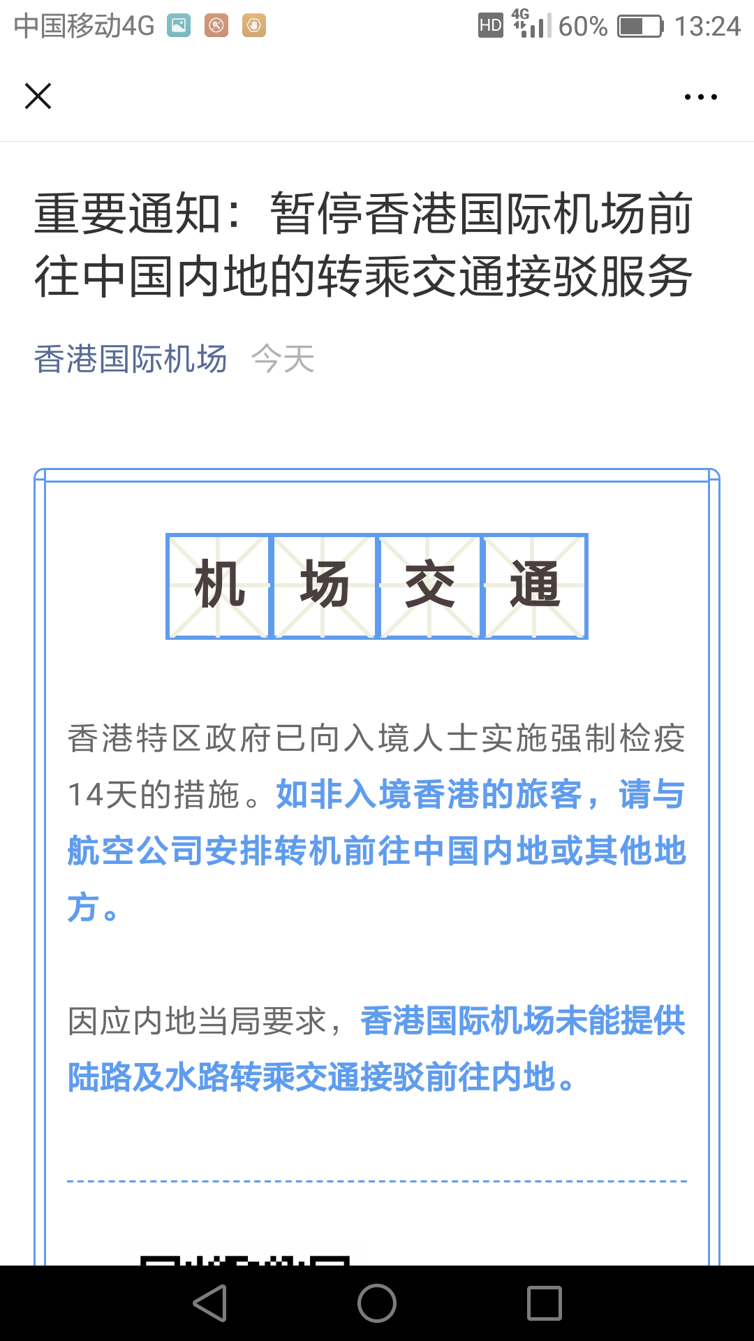 22日早間,來自香港國際機場的消息稱,香港特區(qū)政府已向入境人士實施強制檢疫14天措施,香港國際機場將不能提供陸路及水路轉(zhuǎn)乘交通接駁前往內(nèi)地。