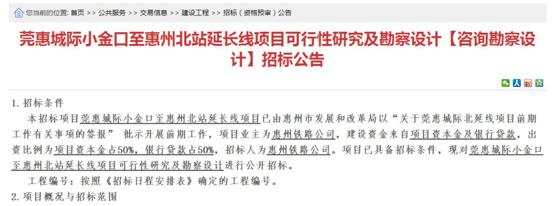 公告顯示,莞惠城際小金口至惠州北站延長線正進行可行性研究及勘察設(shè)計招標,招標金額為7452.47萬元(含稅價)。
