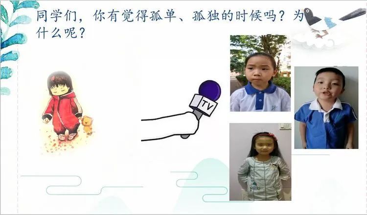 在劉老師的課堂上,她帶來《樹和喜鵲》故事中主人公小喜鵲日記本獎(jiǎng)勵(lì)讀書流利、情感充沛的孩子們。通過小喜鵲的日記,婉儀老師將課堂成功地轉(zhuǎn)接到課文的文本當(dāng)中。進(jìn)而有對(duì)文章中出現(xiàn)的事物、事物所具備的特點(diǎn)展開了細(xì)致而有趣的學(xué)習(xí)。期間,婉儀老師還化身小記者,用三段對(duì)于自己學(xué)生的采訪視頻,讓學(xué)生對(duì)于“孤單”二字有了更加深刻的理解。