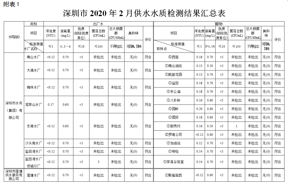見(jiàn)圳客戶端·深圳新聞網(wǎng)2020年4月4日訊(見(jiàn)圳客戶端、深圳新聞網(wǎng)記者葉梅)2020年2月,深圳市水務(wù)局對(duì)全市42個(gè)水廠出廠水水樣以及68個(gè)管網(wǎng)水水樣進(jìn)行了抽檢。檢測(cè)結(jié)果表明,依據(jù)GB5749—2006《生活飲用水衛(wèi)生標(biāo)準(zhǔn)》,所有受檢42個(gè)出廠水水樣和68個(gè)管網(wǎng)水水樣的渾濁度、消毒劑(游離氯或二氧化氯或總氯)、色度、菌落總數(shù)、總大腸菌群及臭和味共6項(xiàng)常規(guī)指標(biāo)全部符合該標(biāo)準(zhǔn)的規(guī)定,出廠水水樣合格率為100%,管網(wǎng)水合格率為100%。