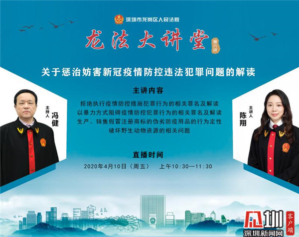 4月10日上午,龍崗法院“龍法大講堂”上線第六講,再次以直播方式,就妨害疫情防控違法犯罪問題向觀眾進(jìn)行詳細(xì)解讀。