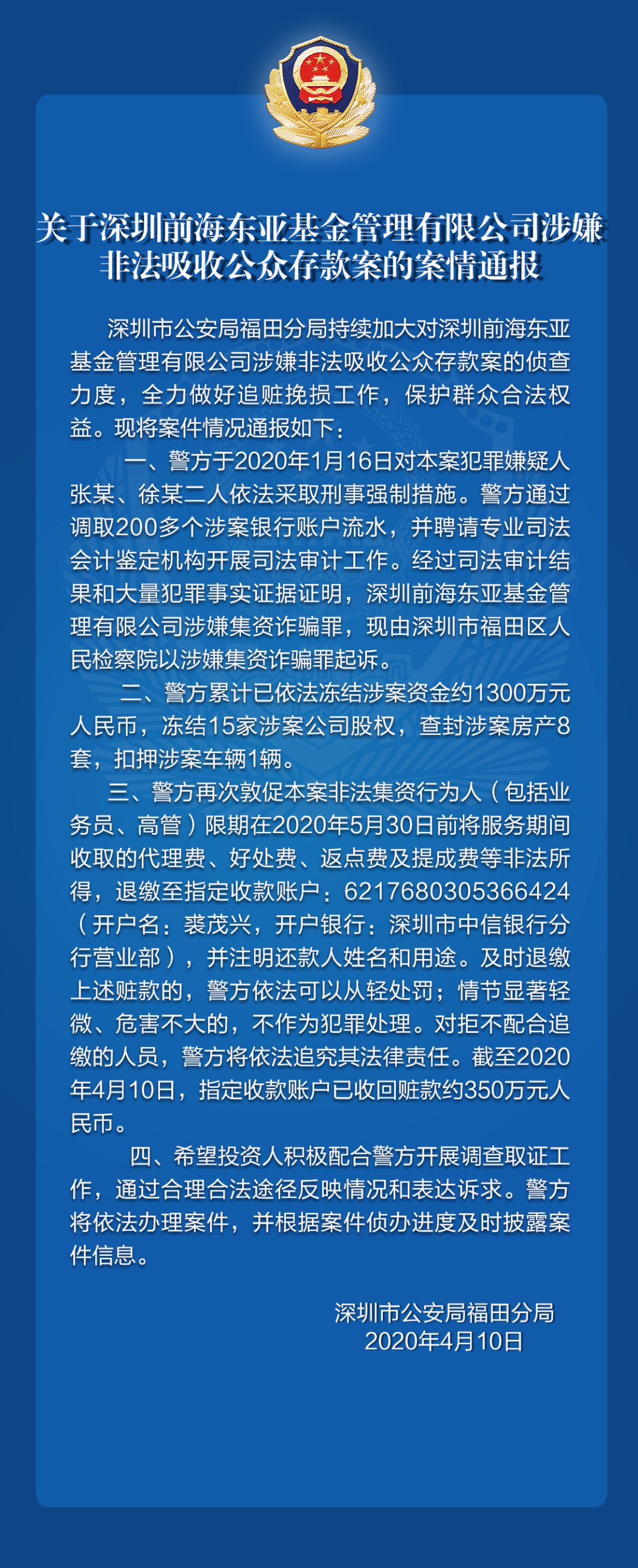 關(guān)于深圳前海東亞基金管理有限公司涉嫌非法吸收公眾存款、深圳市三河投資控股有限公司涉嫌集資詐騙的案件情況通報